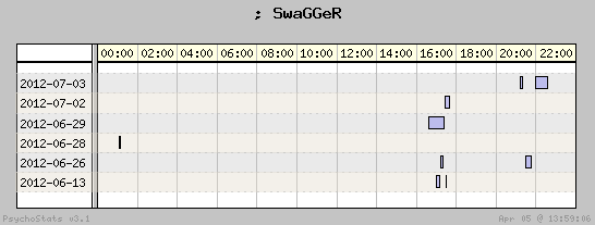 | 2012-06-29 | 4 | 9 | 0.44 | 1 | 25.00% | 15.00% | 00:35:56 | 376.08 |