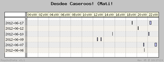 | 2012-06-17 | 7 | 15 | 0.47 | 4 | 57.14% | 4.48% | 00:20:16 | 217.84 |