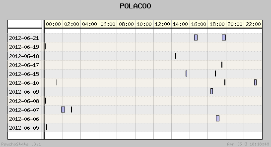 | 2012-06-08 | 1 | 1 | 1.00 | 0 | 0.00% | 23.81% | 00:00:55 | 304.60 |
