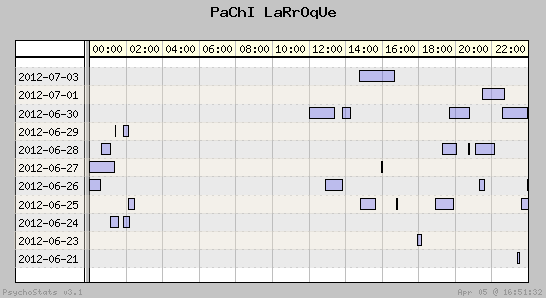 | 2012-06-24 | 19 | 25 | 0.76 | 5 | 26.32% | 15.24% | 00:45:17 | 364.32 |