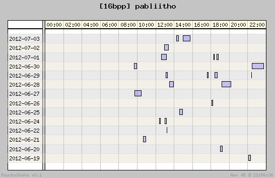| 2012-07-03 | 16 | 24 | 0.67 | 5 | 31.25% | 16.63% | 00:57:40 | 171.87 |