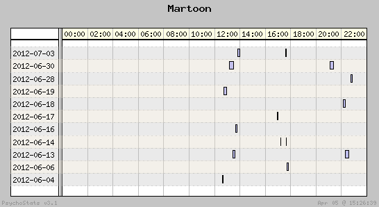 | 2012-06-19 | 13 | 6 | 2.17 | 5 | 38.46% | 22.96% | 00:16:24 | 534.72 |