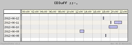 | 2012-06-12 | 4 | 8 | 0.50 | 2 | 50.00% | 13.71% | 00:10:20 | 309.06 |