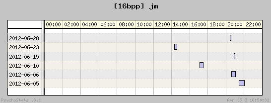 | 2012-06-05 | 17 | 21 | 0.81 | 7 | 41.18% | 17.39% | 00:34:30 | 330.87 |
