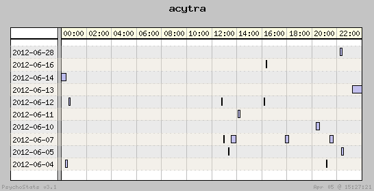 | 2012-06-05 | 3 | 7 | 0.43 | 1 | 33.33% | 14.29% | 00:12:09 | 211.20 |