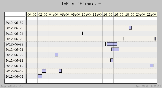 | 2012-06-10 | 15 | 19 | 0.79 | 6 | 40.00% | 11.64% | 00:32:50 | 494.59 |