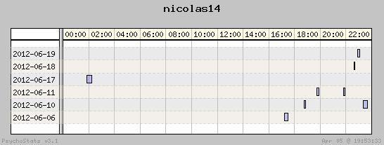 | 2012-06-17 | 2 | 14 | 0.14 | 0 | 0.00% | 11.67% | 00:22:14 | 61.84 |
