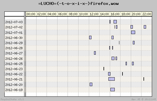 | 2012-06-25 | 20 | 14 | 1.43 | 7 | 35.00% | 14.09% | 00:25:45 | 260.58 |