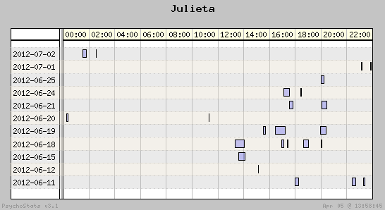 | 2012-06-24 | 5 | 7 | 0.71 | 2 | 40.00% | 14.29% | 00:25:41 | 156.31 |