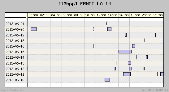| 2012-06-14 | 6 | 10 | 0.60 | 2 | 33.33% | 9.60% | 00:18:52 | 168.15 |