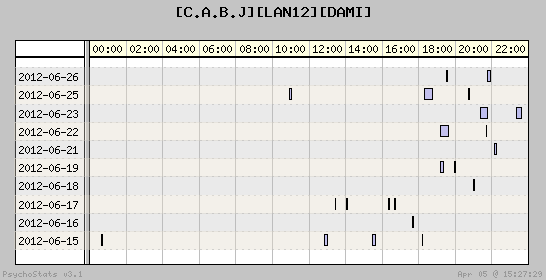 | 2012-06-22 | 8 | 18 | 0.44 | 3 | 37.50% | 20.27% | 00:27:31 | 93.46 |