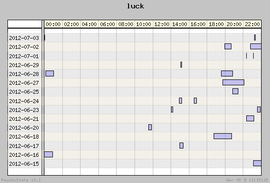| 2012-06-24 | 28 | 15 | 1.87 | 8 | 28.57% | 23.16% | 00:31:58 | 378.62 |