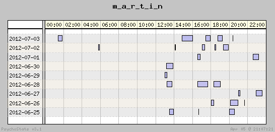 | 2012-07-02 | 28 | 26 | 1.08 | 13 | 46.43% | 13.43% | 00:49:33 | 323.98 |