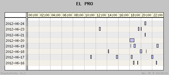 | 2012-06-23 | 5 | 9 | 0.56 | 2 | 40.00% | 15.56% | 00:27:45 | 134.74 |