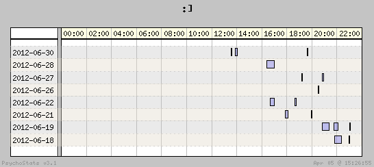 | 2012-06-30 | 15 | 4 | 3.75 | 5 | 33.33% | 15.70% | 00:11:46 | 141.02 |