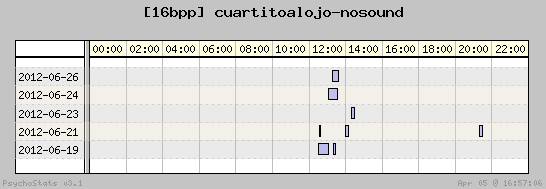 | 2012-06-24 | 21 | 16 | 1.31 | 12 | 57.14% | 21.02% | 00:28:33 | 154.78 |