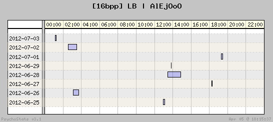 | 2012-07-02 | 18 | 27 | 0.67 | 8 | 44.44% | 23.99% | 00:49:26 | 185.55 |