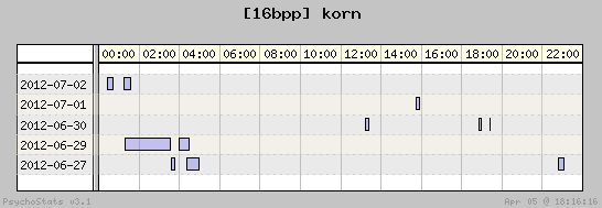 | 2012-07-02 | 10 | 22 | 0.45 | 4 | 40.00% | 14.68% | 00:38:35 | 196.44 |